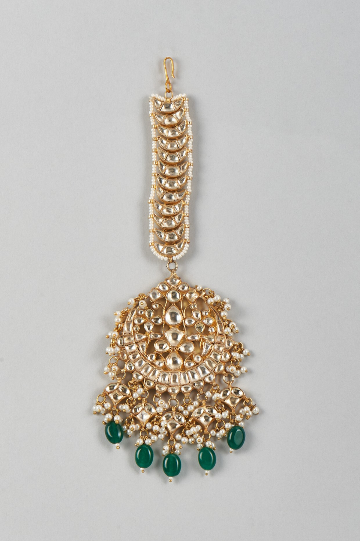 Ineeta is prettiest pachi kundan oversized maangtika. The bottom is highlighted with dangling pearls and green beads for a timeless look.