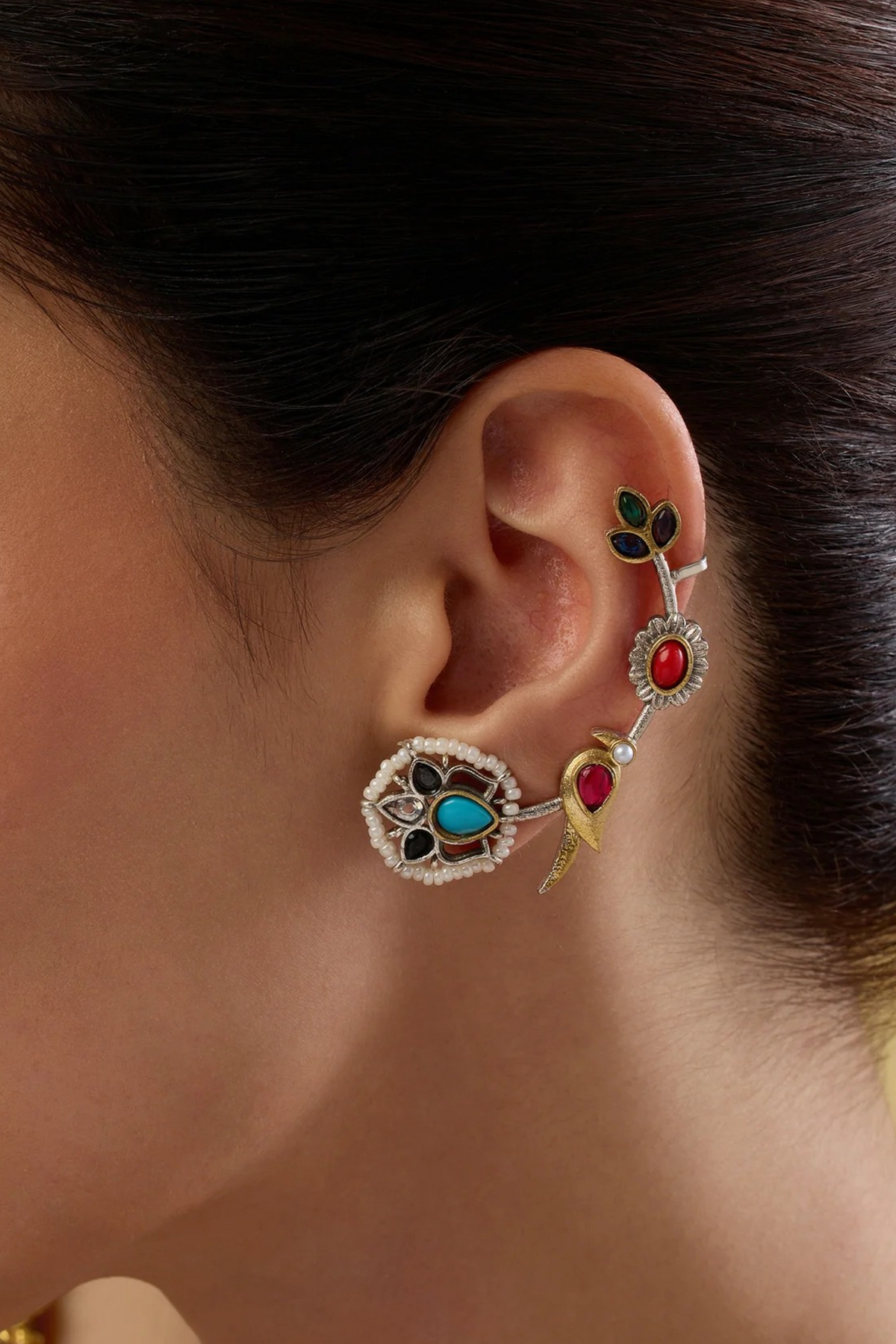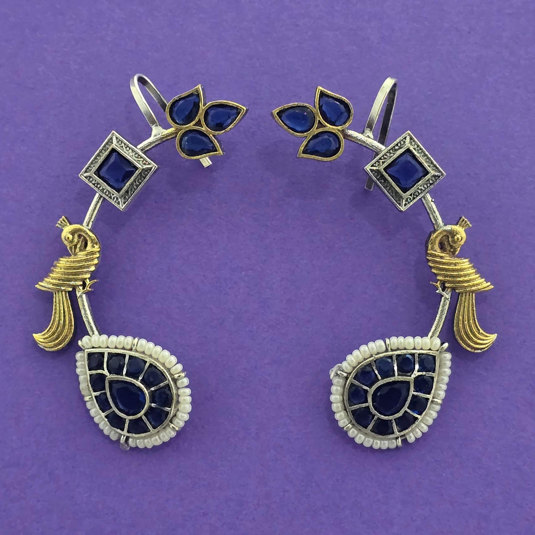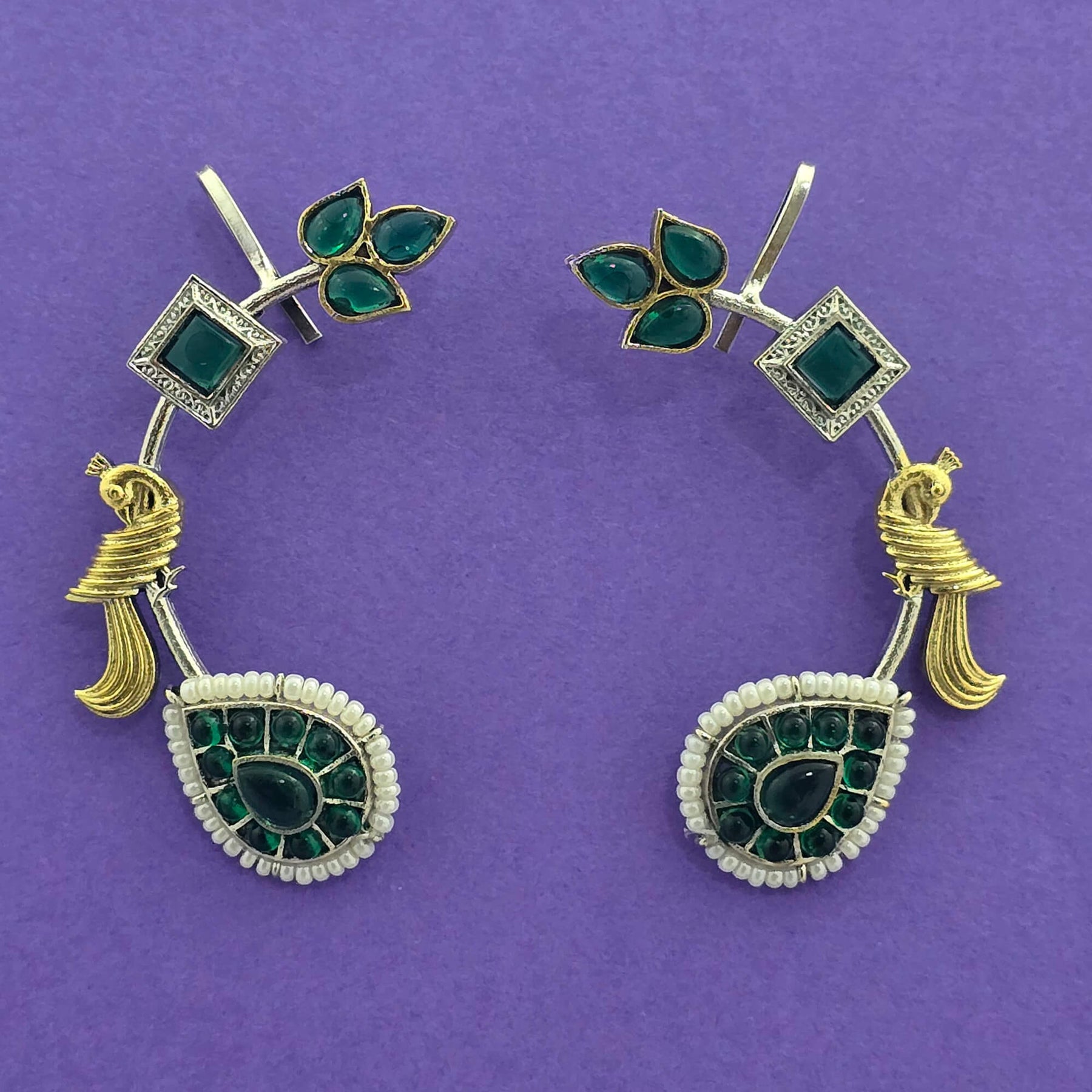 A pretty pair of ear cuff style earrings. It is intricately handcrafted in dual tone polish.