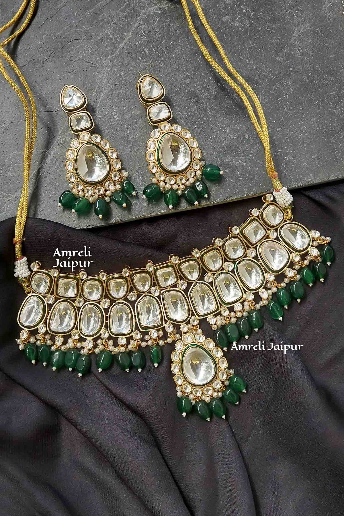 Mahil is a polki delight. It is designed with a keen eye for small details like the emerald lining between the large gleaming polkis. Indeed, makes it an ethereal beauty!