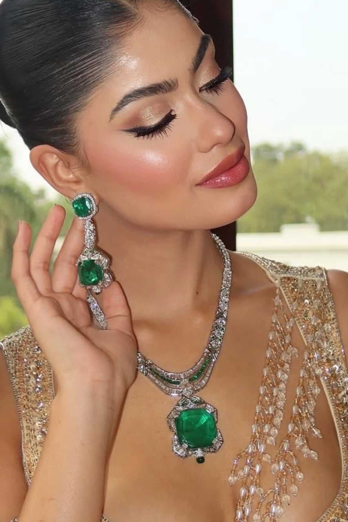 Inspired from recent jaw dropping look of Priyanka Chopra, this set is a true beauty in cubic zirconia and big doublet stone that adorns the neck resplendently.